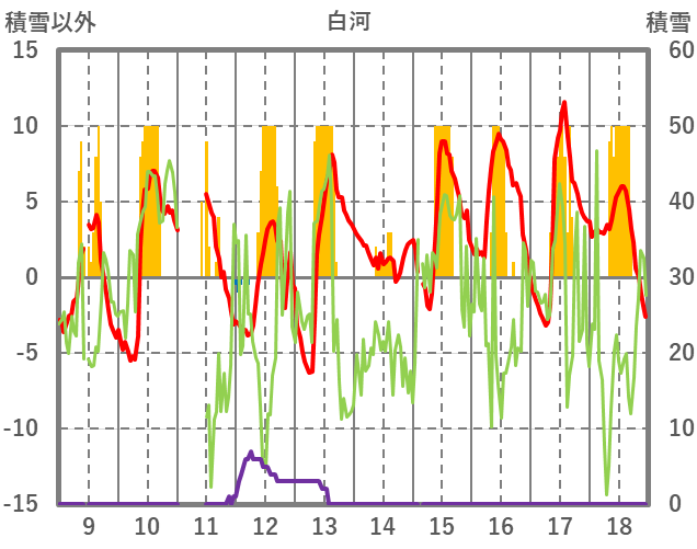 | 日 | 時 | 気温 | 降水 | 風向/風速 | 日照 | 積雪 | 降雪 |