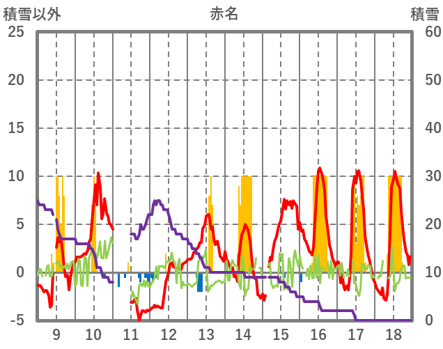 | 日 | 時 | 気温 | 降水 | 風向/風速 | 日照 | 積雪 | 降雪 |