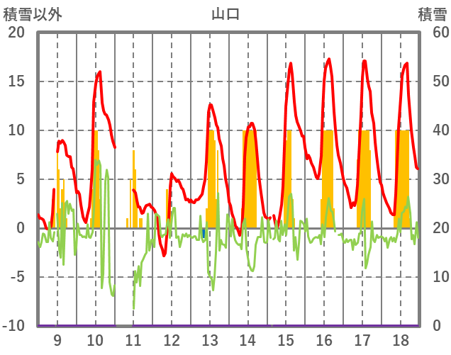 | 日 | 時 | 気温 | 降水 | 風向/風速 | 日照 | 積雪 | 降雪 |