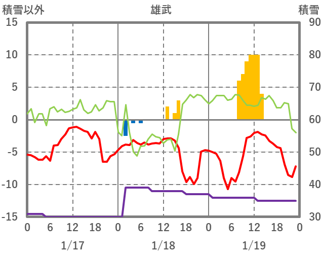 | 日 | 時 | 気温 | 降水 | 風向/風速 | 日照 | 積雪 | 降雪 |