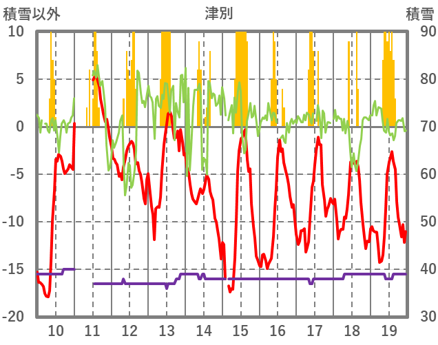 | 日 | 時 | 気温 | 降水 | 風向/風速 | 日照 | 積雪 | 降雪 |