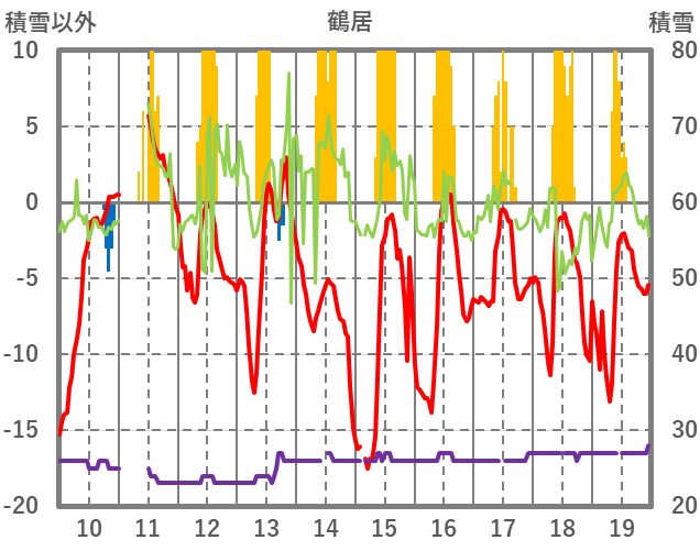 | 日 | 時 | 気温 | 降水 | 風向/風速 | 日照 | 積雪 | 降雪 |