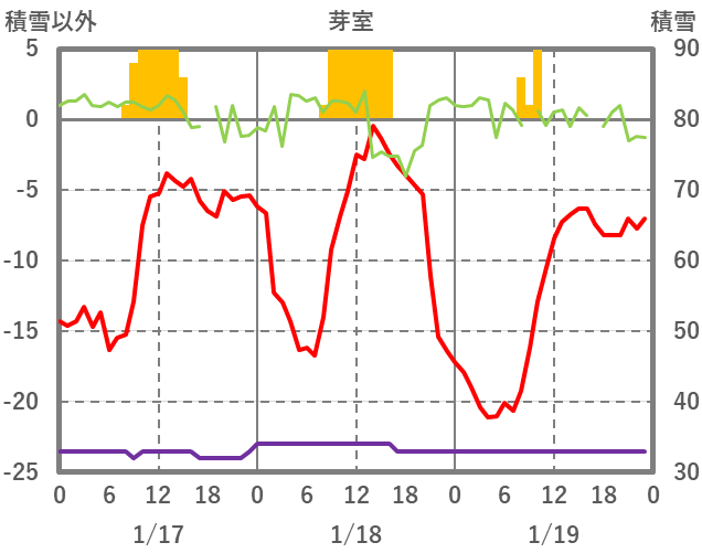 | 日 | 時 | 気温 | 降水 | 風向/風速 | 日照 | 積雪 | 降雪 |