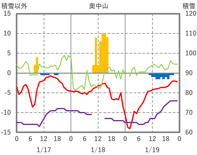 | 日 | 時 | 気温 | 降水 | 風向/風速 | 日照 | 積雪 | 降雪 |