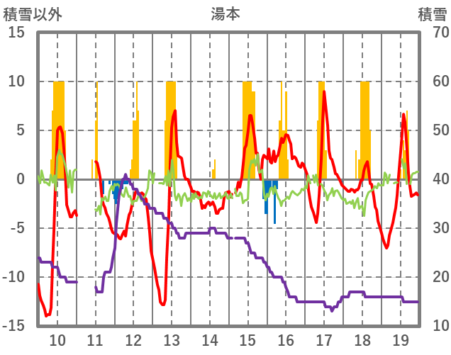 | 日 | 時 | 気温 | 降水 | 風向/風速 | 日照 | 積雪 | 降雪 |