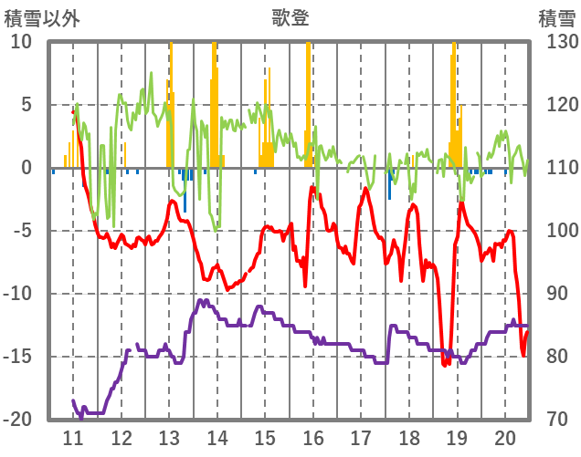 | 日 | 時 | 気温 | 降水 | 風向/風速 | 日照 | 積雪 | 降雪 |