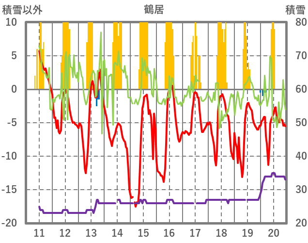 | 日 | 時 | 気温 | 降水 | 風向/風速 | 日照 | 積雪 | 降雪 |