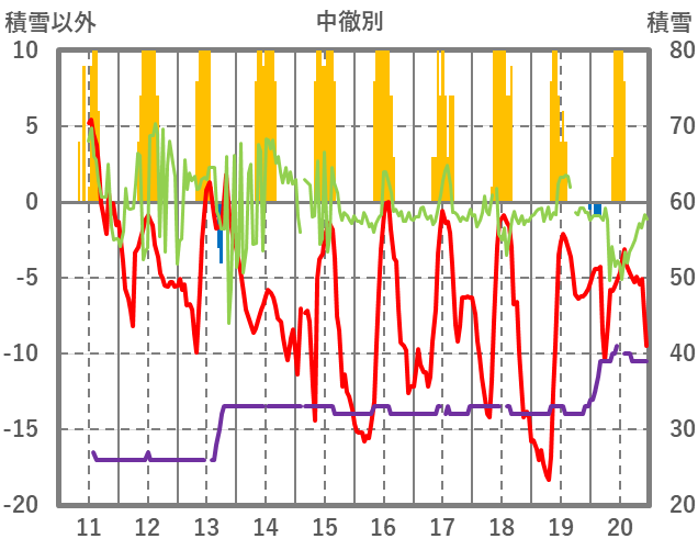 | 日 | 時 | 気温 | 降水 | 風向/風速 | 日照 | 積雪 | 降雪 |