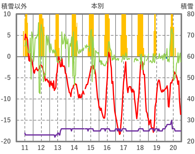 | 日 | 時 | 気温 | 降水 | 風向/風速 | 日照 | 積雪 | 降雪 |