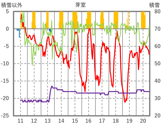 | 日 | 時 | 気温 | 降水 | 風向/風速 | 日照 | 積雪 | 降雪 |
