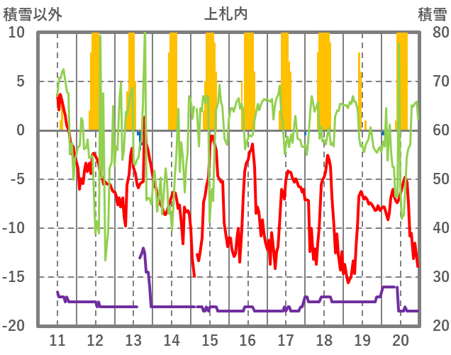 | 日 | 時 | 気温 | 降水 | 風向/風速 | 日照 | 積雪 | 降雪 |