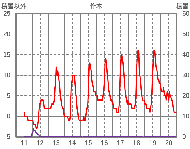 | 日 | 時 | 気温 | 降水 | 風向/風速 | 日照 | 積雪 | 降雪 |