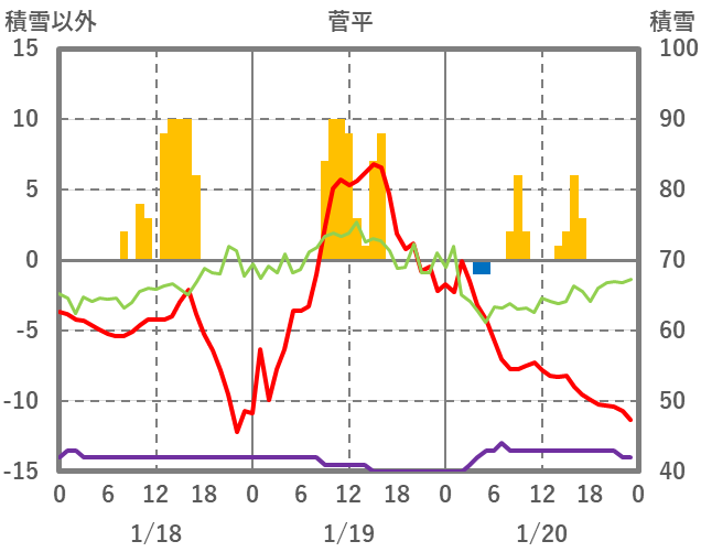 | 日 | 時 | 気温 | 降水 | 風向/風速 | 日照 | 積雪 | 降雪 |