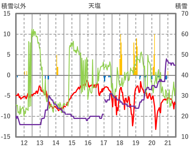 | 日 | 時 | 気温 | 降水 | 風向/風速 | 日照 | 積雪 | 降雪 |