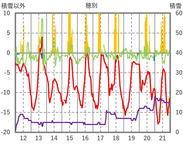 | 日 | 時 | 気温 | 降水 | 風向/風速 | 日照 | 積雪 | 降雪 |