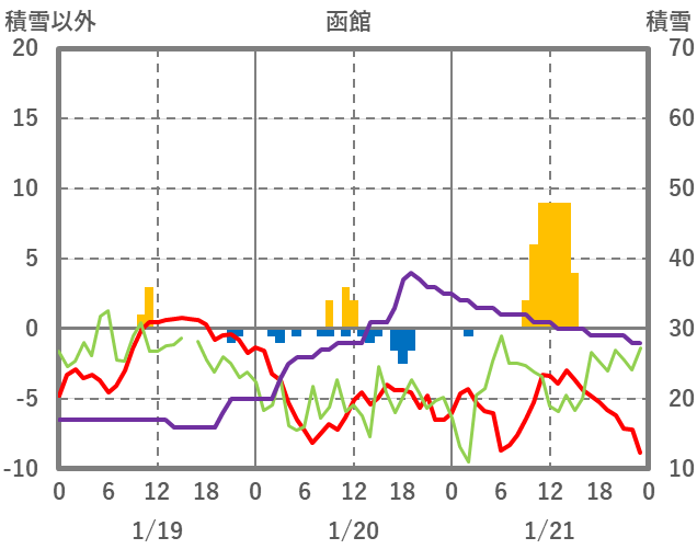 | 日 | 時 | 気温 | 降水 | 風向/風速 | 日照 | 積雪 | 降雪 |