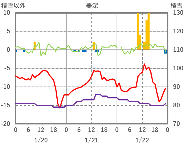 | 日 | 時 | 気温 | 降水 | 風向/風速 | 日照 | 積雪 | 降雪 |