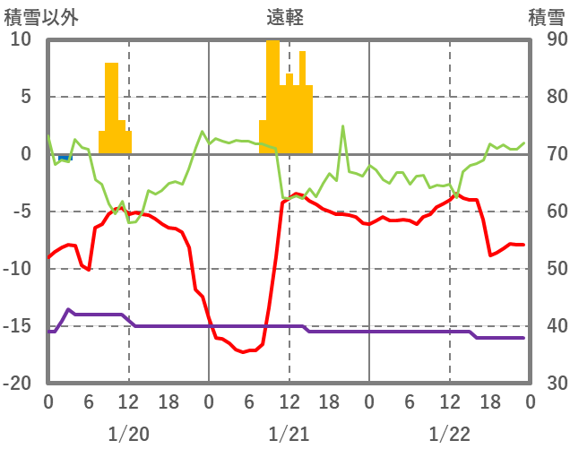 | 日 | 時 | 気温 | 降水 | 風向/風速 | 日照 | 積雪 | 降雪 |