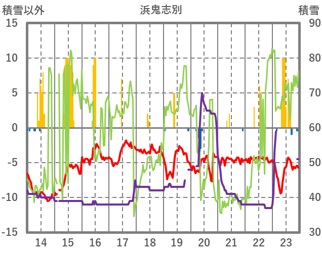 | 日 | 時 | 気温 | 降水 | 風向/風速 | 日照 | 積雪 | 降雪 |