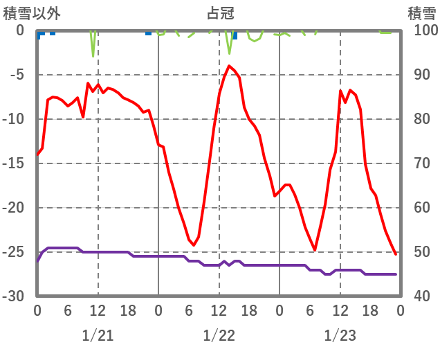 | 日 | 時 | 気温 | 降水 | 風向/風速 | 日照 | 積雪 | 降雪 |