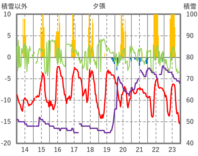 | 日 | 時 | 気温 | 降水 | 風向/風速 | 日照 | 積雪 | 降雪 |