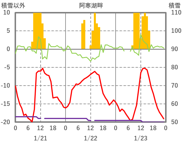 | 日 | 時 | 気温 | 降水 | 風向/風速 | 日照 | 積雪 | 降雪 |