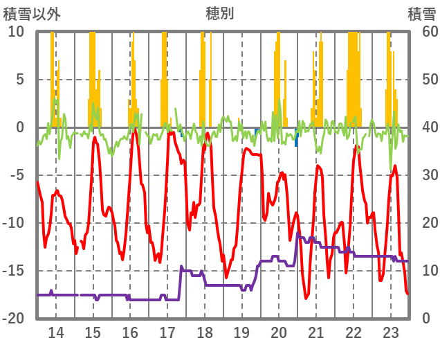 | 日 | 時 | 気温 | 降水 | 風向/風速 | 日照 | 積雪 | 降雪 |