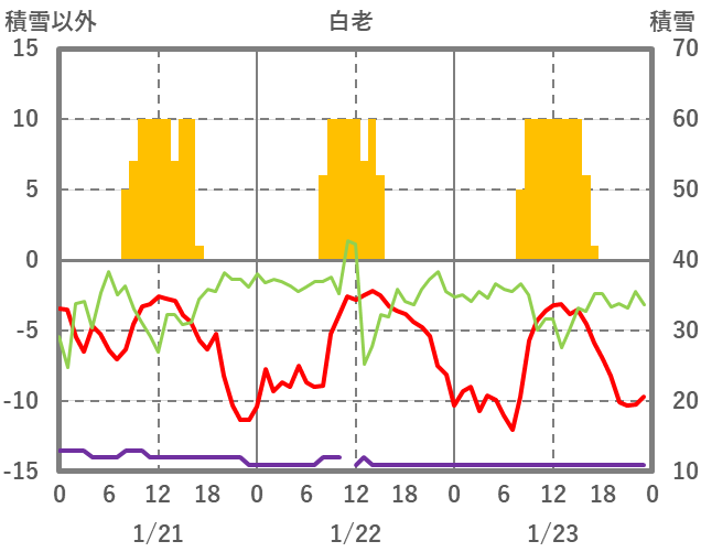 | 日 | 時 | 気温 | 降水 | 風向/風速 | 日照 | 積雪 | 降雪 |