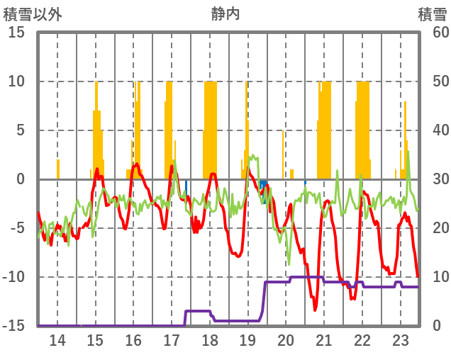 | 日 | 時 | 気温 | 降水 | 風向/風速 | 日照 | 積雪 | 降雪 |