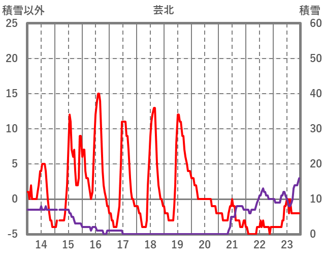 | 日 | 時 | 気温 | 降水 | 風向/風速 | 日照 | 積雪 | 降雪 |