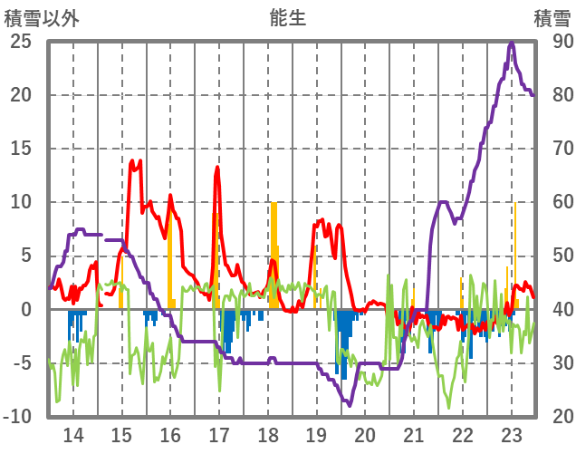 | 日 | 時 | 気温 | 降水 | 風向/風速 | 日照 | 積雪 | 降雪 |