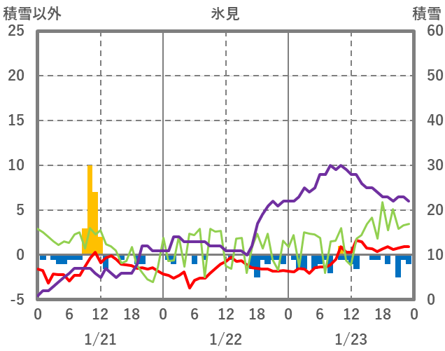 | 日 | 時 | 気温 | 降水 | 風向/風速 | 日照 | 積雪 | 降雪 |