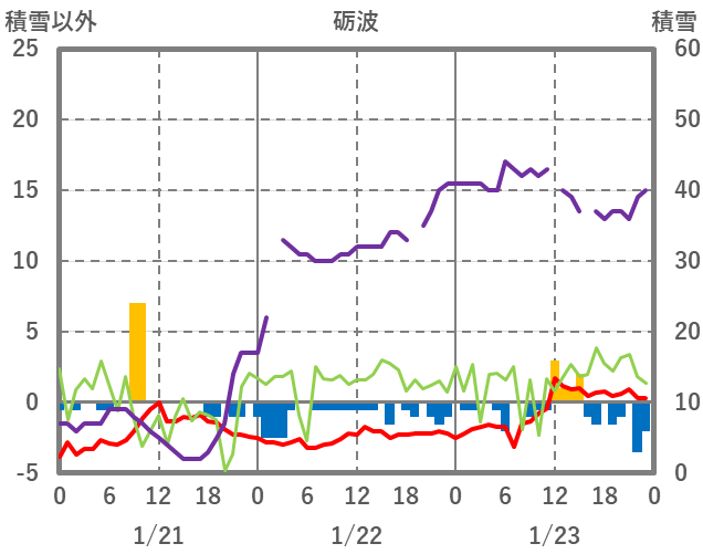 | 日 | 時 | 気温 | 降水 | 風向/風速 | 日照 | 積雪 | 降雪 |