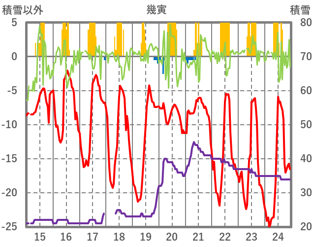 | 日 | 時 | 気温 | 降水 | 風向/風速 | 日照 | 積雪 | 降雪 |