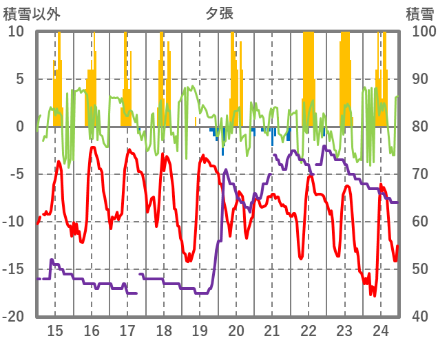 | 日 | 時 | 気温 | 降水 | 風向/風速 | 日照 | 積雪 | 降雪 |