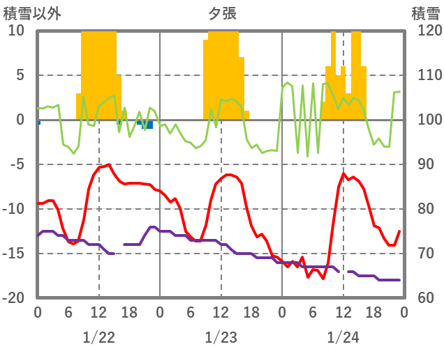 | 日 | 時 | 気温 | 降水 | 風向/風速 | 日照 | 積雪 | 降雪 |