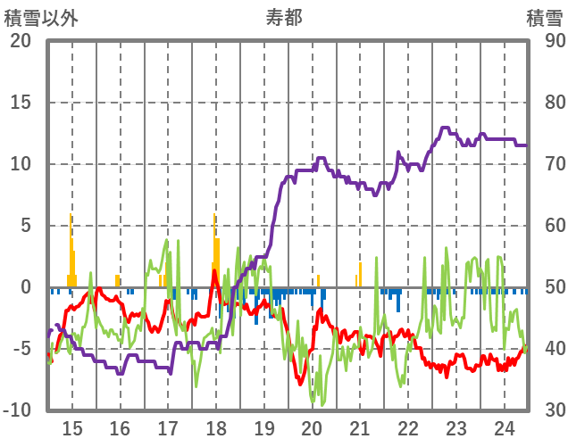 | 日 | 時 | 気温 | 降水 | 風向/風速 | 日照 | 積雪 | 降雪 |