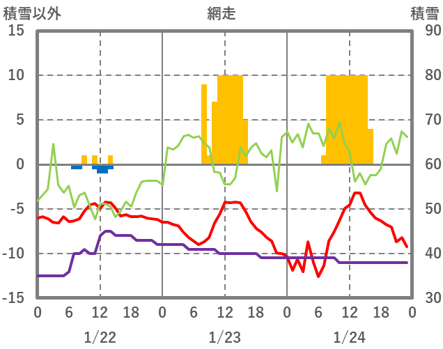 | 日 | 時 | 気温 | 降水 | 風向/風速 | 日照 | 積雪 | 降雪 |