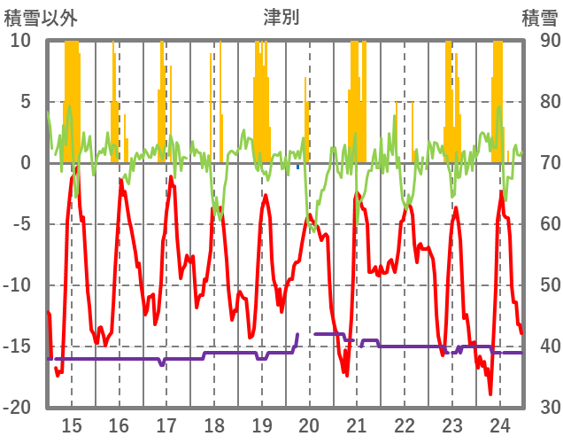 | 日 | 時 | 気温 | 降水 | 風向/風速 | 日照 | 積雪 | 降雪 |