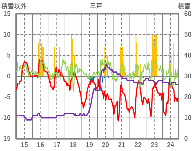 | 日 | 時 | 気温 | 降水 | 風向/風速 | 日照 | 積雪 | 降雪 |