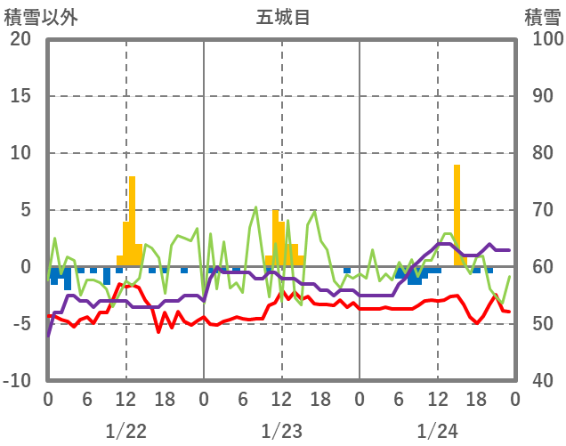 | 日 | 時 | 気温 | 降水 | 風向/風速 | 日照 | 積雪 | 降雪 |