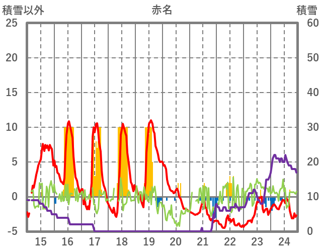 | 日 | 時 | 気温 | 降水 | 風向/風速 | 日照 | 積雪 | 降雪 |