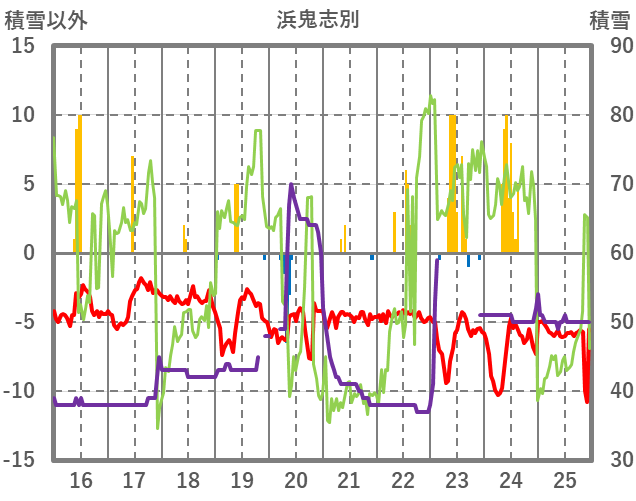 | 日 | 時 | 気温 | 降水 | 風向/風速 | 日照 | 積雪 | 降雪 |