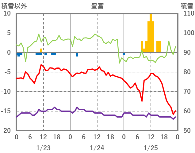 | 日 | 時 | 気温 | 降水 | 風向/風速 | 日照 | 積雪 | 降雪 |
