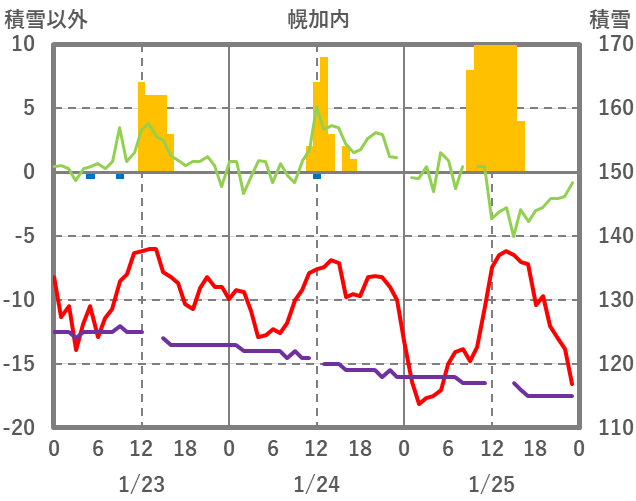 | 日 | 時 | 気温 | 降水 | 風向/風速 | 日照 | 積雪 | 降雪 |