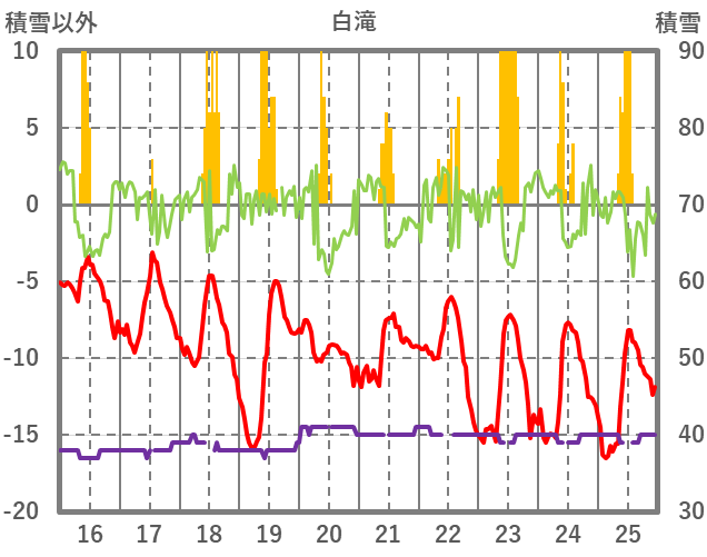 | 日 | 時 | 気温 | 降水 | 風向/風速 | 日照 | 積雪 | 降雪 |