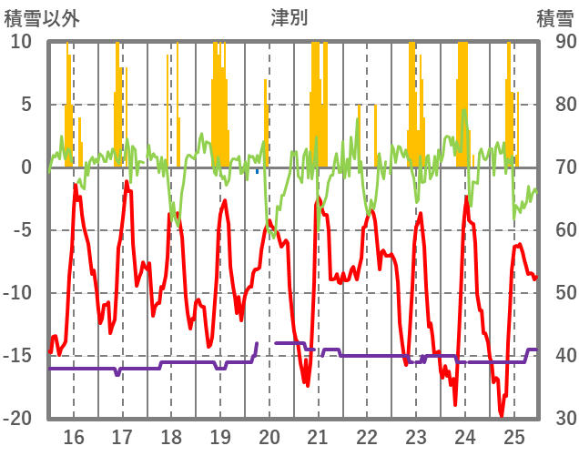 | 日 | 時 | 気温 | 降水 | 風向/風速 | 日照 | 積雪 | 降雪 |