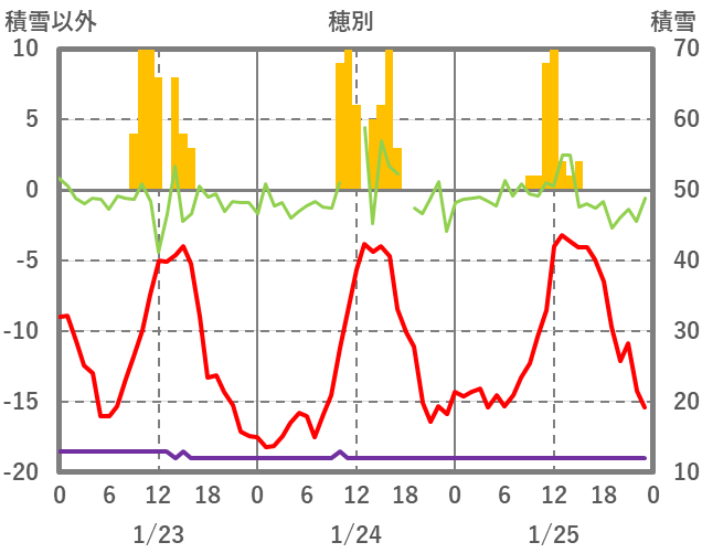 | 日 | 時 | 気温 | 降水 | 風向/風速 | 日照 | 積雪 | 降雪 |