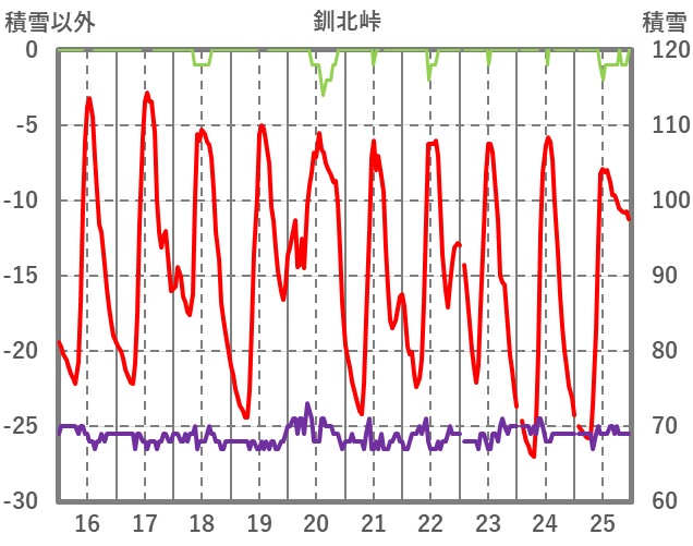 | 日 | 時 | 気温 | 降水 | 風向/風速 | 日照 | 積雪 | 降雪 |