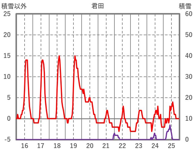 | 日 | 時 | 気温 | 降水 | 風向/風速 | 日照 | 積雪 | 降雪 |